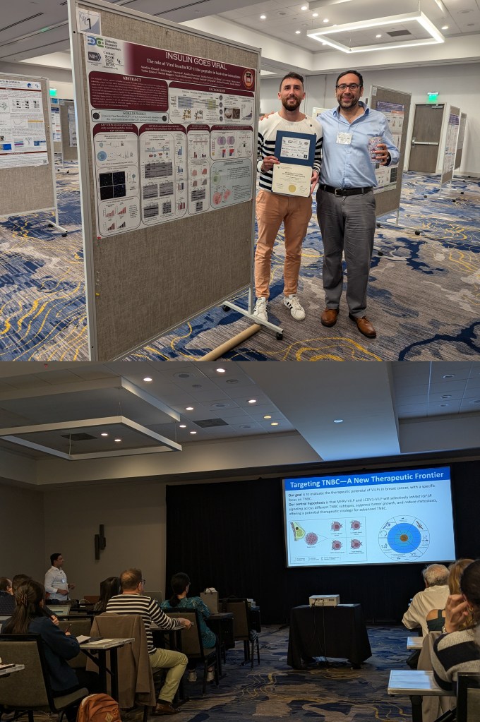 The Altindis Lab participated in the 2025 GRC on IGF-1 and Insulin Systems in Physiology and Disease, held in Ventura, California. Sudarshan delivered an oral presentation, while Aurelien presented both a poster and an oral talk. Both received travel awards in recognition of their contributions, and Aurelien was honored with the Best Poster Award.